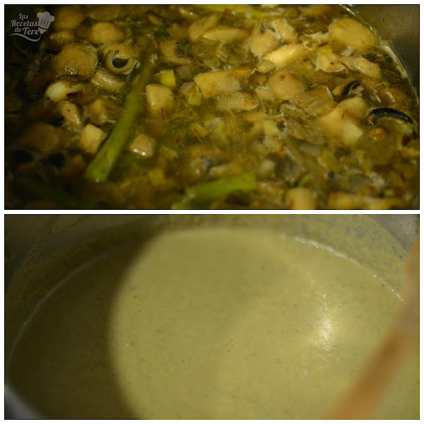 Corta los puerros en rueditas finas, limpia y corta los champiñones, ponlos a freir en un chorrito de aceite con los dientes de ajo enteros pelados y machacados, remueve todo el tiempo hasta que se cocinen. Añade sal. Incorpora los espárragos ya cocinados y picados para que se integren los sabores, echa un chorro de vino blanco, deja hervir hasta que se evapore. Cubre con un litro de caldo de verduras, si lo has hecho en casa, pasa por un colador, y deja cocer unos 15 minutos a fuego suave, si quieres una crema más o menos espesa, utiliza más o menos caldo de verduras. Rectifica la sal y añade la pimienta.