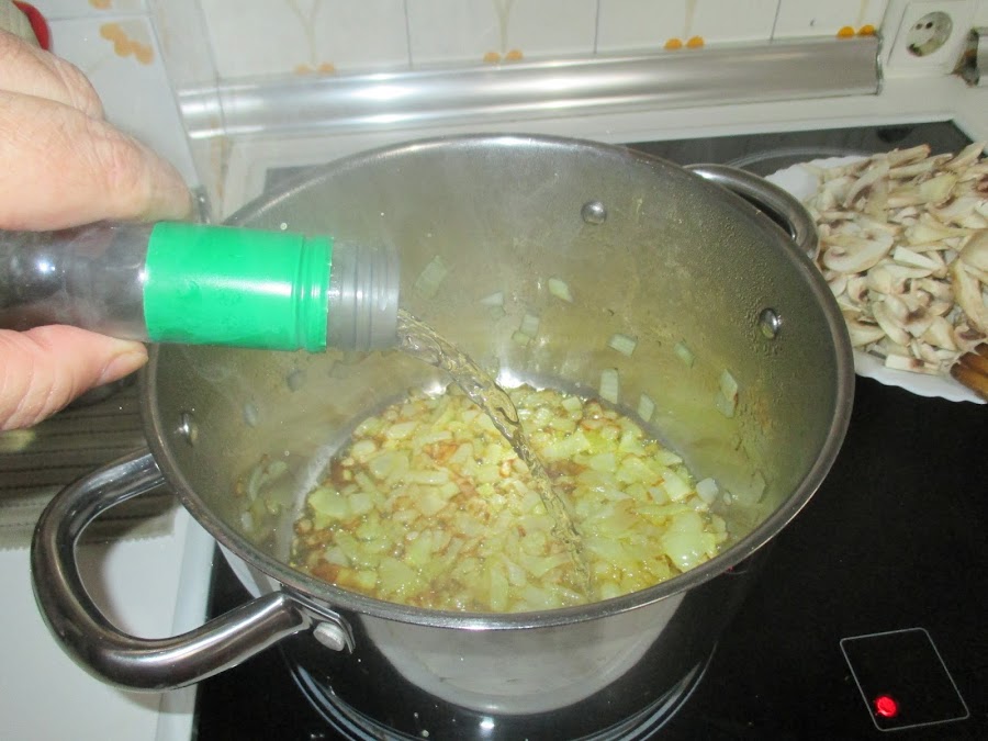 Cuando la cebolla esté pochada añadimos un buen chorro de vino blanco y dejamos evaporar.