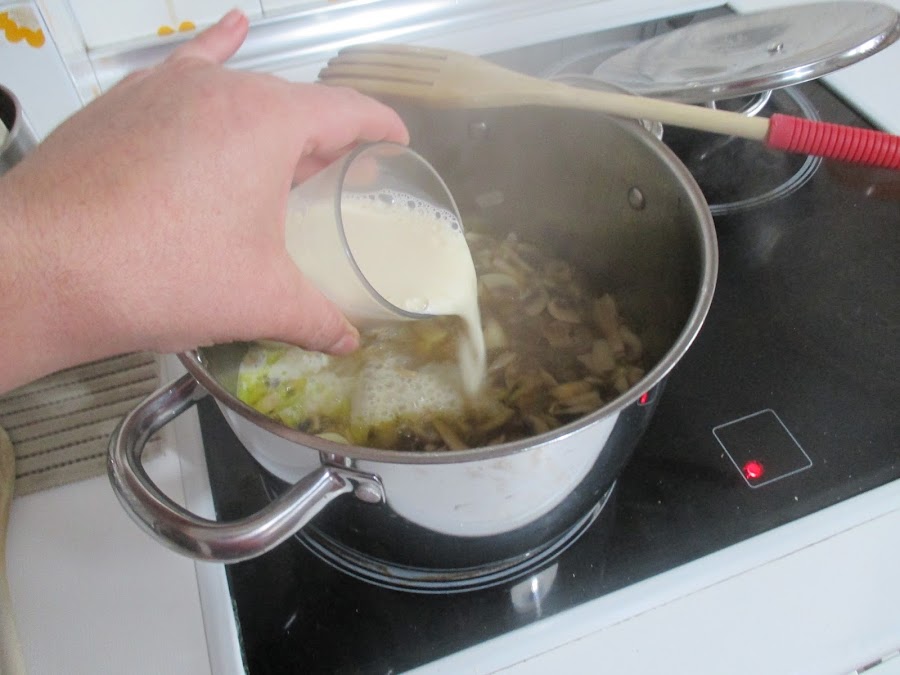 Añadimos la nata (crema de leche) o leche evaporada y rectificamos de sal y pimienta. Y retiramos del fuego.