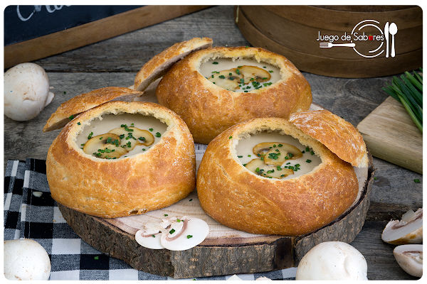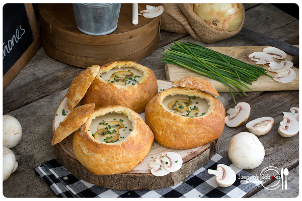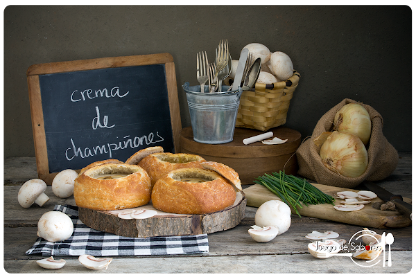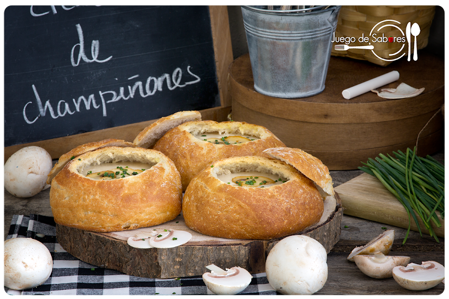 A ver. Vayamos por partes. No es que todos, absolutamente todos los platos soperos y boles de la casa estuvieran en el lavavajillas y que los invitados ya estuviesen llamando a la puerta. Pero un poco, sí. Me distraje, se me fue el santo al cielo y entre unas cosas y otras se me olvidó poner en marcha el aparatejo. Y eso que había puesto la pastilla en el cajetín. Había estado preparando la crema de champiñones y una inoportuna llamada al móvil me entretuvo. Total, que se me echó el tiempo encima y había que improvisar. Se me ocurrió utilizar unos panes redondos, previamente vaciados de su miga, como platos. En una anterior receta - ver Sopa de invierno - ya había usado este truquillo y la verdad es que sorprendió. Como en esta ocasión los invitados eran otros, me dije: repetimos y le daremos al champiñón un plus, porque mira que es triste el papel del champiñón en la cocina, siempre haciendo de comparsa o de guarnición de platos de carta de restaurante de categoría. Y es que la vida del champiñón no es muy alegre que digamos por mucho que se disfrace de tapa de bar y un camarero te lo quiera vender como el no va más de la gastronomía: “¿No has probado estos champiñones al ajillo?” Miras con escepticismo la bandeja oculta tras una mampara de cristal y piensas: “Ni los he probado, ni los probaré”. Ahora bien, como os perdáis esta crema de champiñones que hoy os proponemos no tenéis perdón.