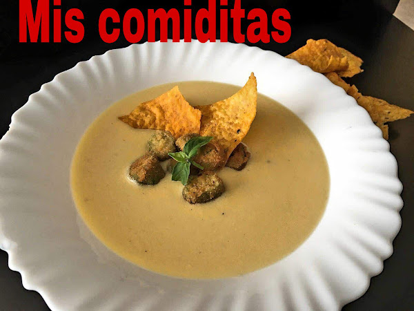 Emplatamos la crema, colocamos encima unos trozos de ocra, unos nachos enteros o picados y una hoja de albahaca.