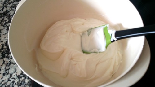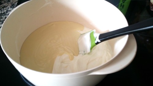 añadir el chocolate blanco derretido batiendo a la vez que añadimos hasta integran bien toda la mezcla.