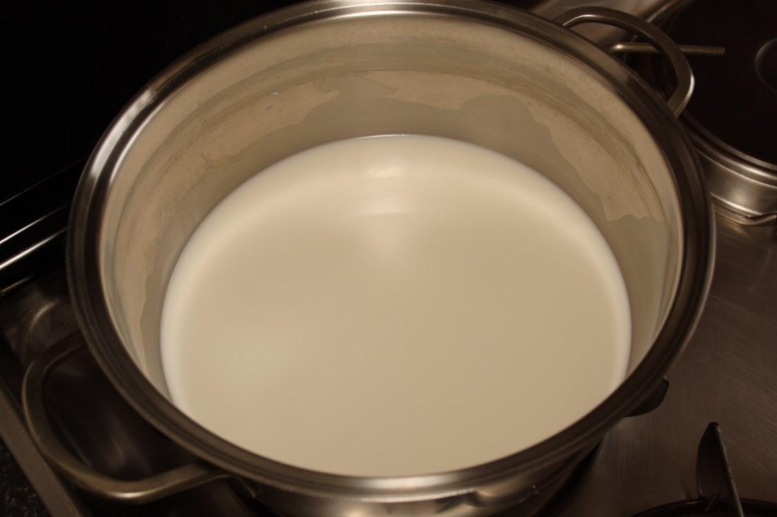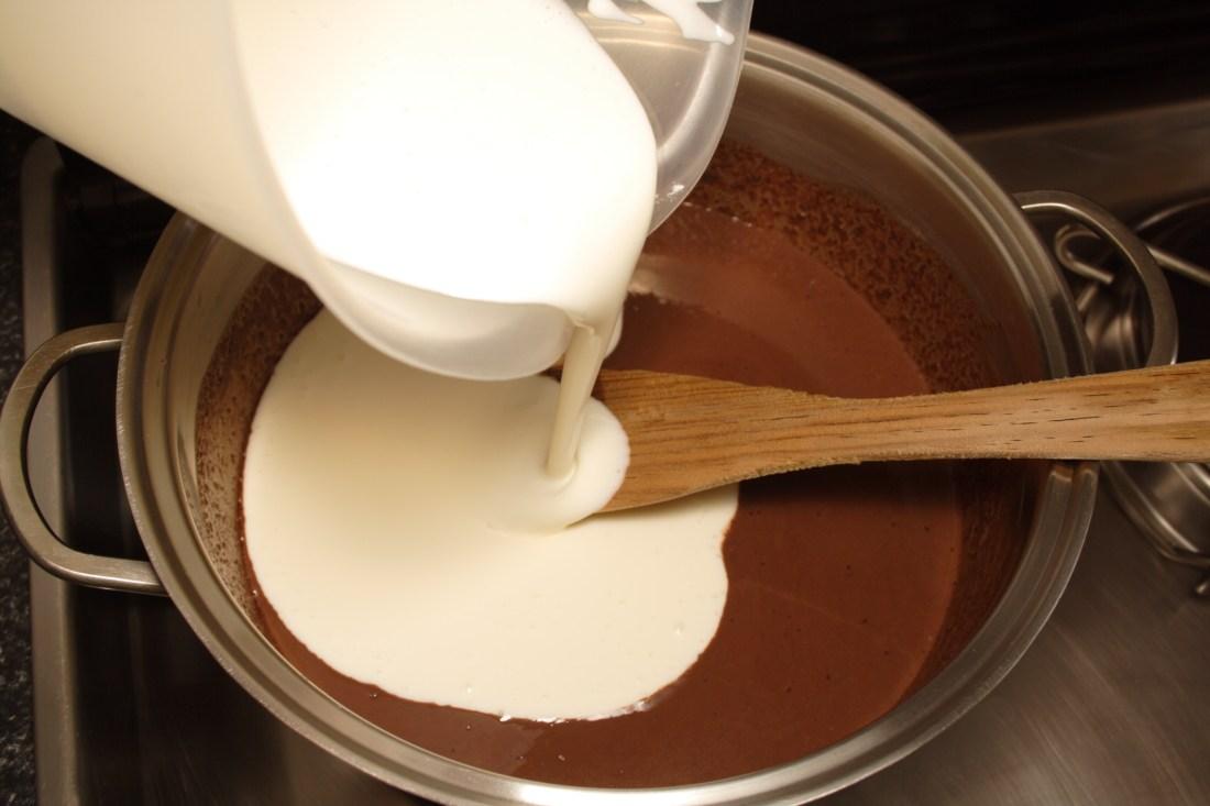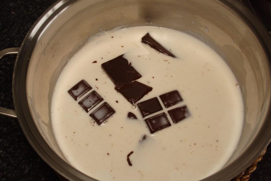 En un cazo, hervimos la leche y fuera del fuego añadimos el chocolate troceado, lo dejamos reposar unos minutos y mezclamos bien hasta que se haya disuelto todo.