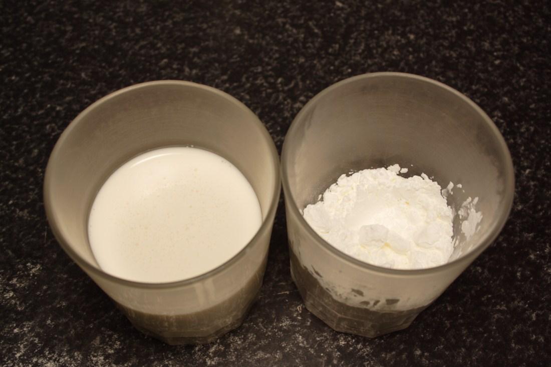 En un vaso disolvemos la harina de maíz en un poco de nata (crema de leche), mezclamos enérgicamente para que se diluya.