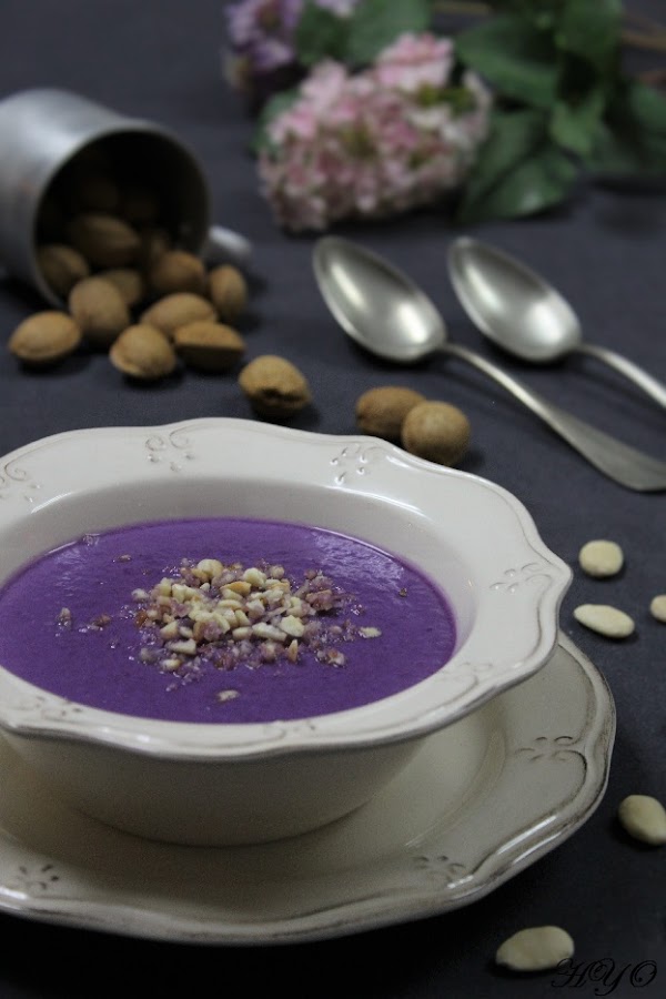 4. Dejamos que se cocine todo a fuego moderado unos 20 o 25 minutos. Retiramos del fuego, añadimos los quesitos en porciones y trituramos con una batidora eléctrica hasta conseguir la textura deseada para la crema. Servimos espolvoreando almendra tostada en cubos por encima.