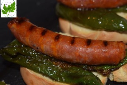 Corta unos trozos de longaniza del tamaño de las rebanadas de pan ( las longanizas vienen en tiras largas). asálas en una parrilla. Mientras tuesta las rebanadas de pan y fríe los pimientos en abundante aceite caliente (escurre el exceso de aceite sobre papel absorvente).