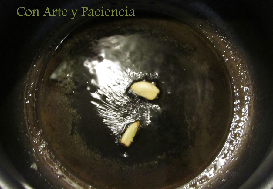 En una sartén con aceite de oliva ponemos un ajo a freír dos minutos para que de sabor. Retiramos. Agregamos los champiñones ya lavados y laminados. Sofreímos 5 minutos.