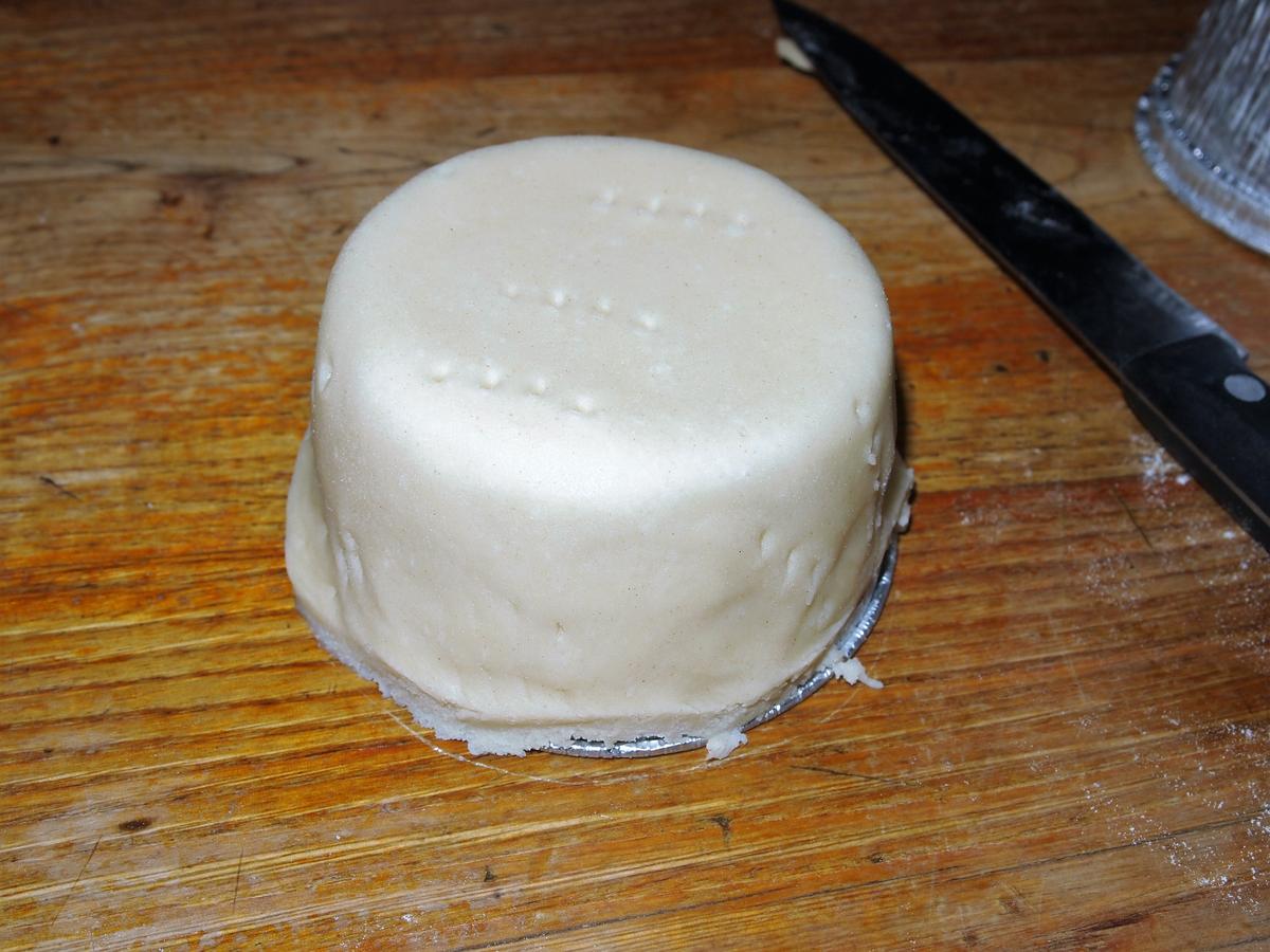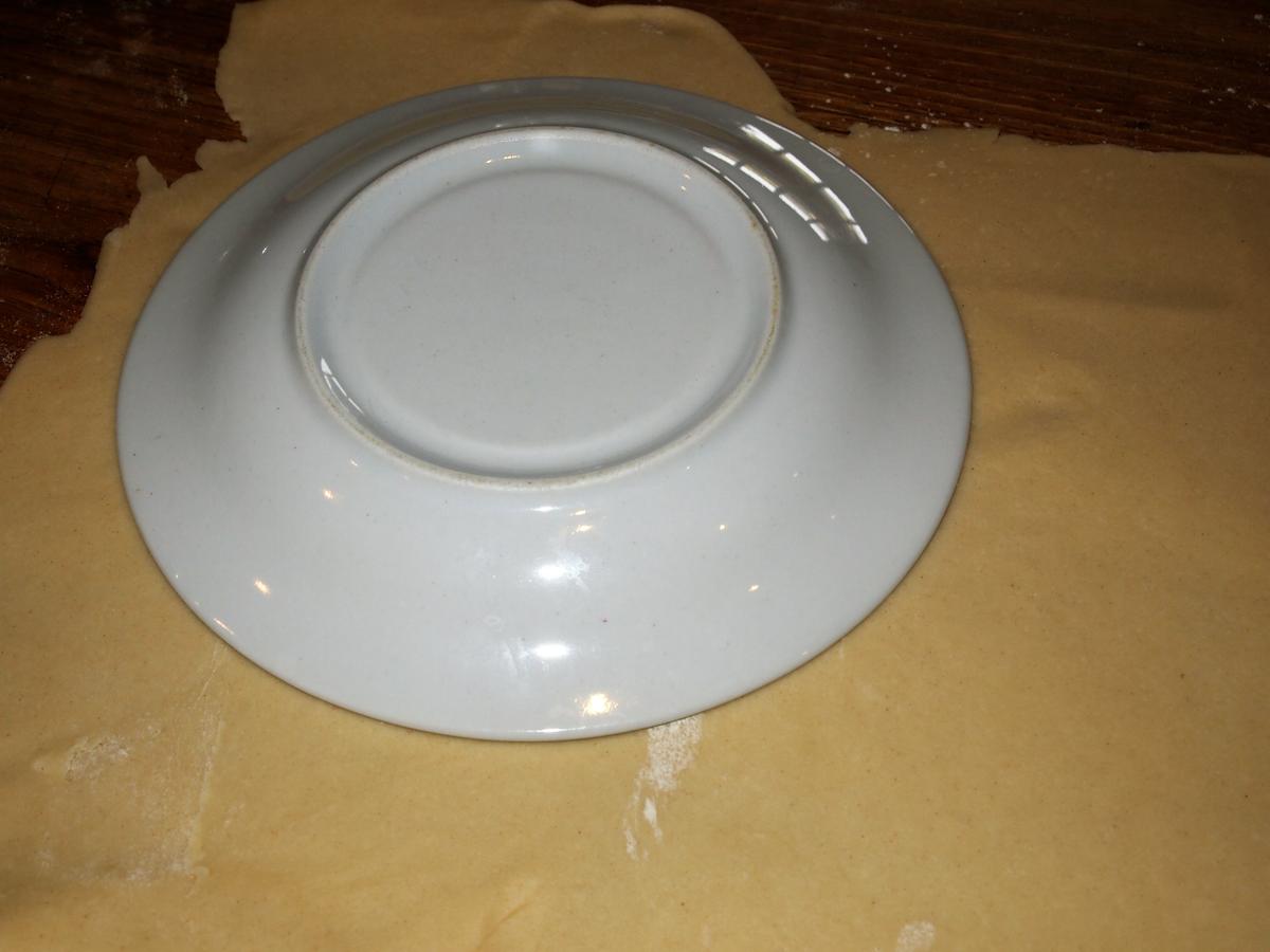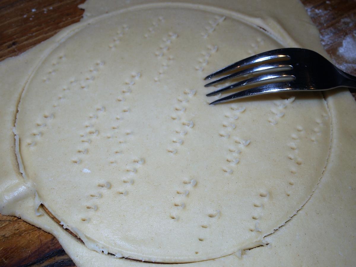 Con un rodillo estiramos nuestra masa, con ayuda de un cortados de galletas, grande, plato o vaso cortamos redondeles un poco más grades que el diámetro del bol que vayamos a usar para formar nuestros cuenquitos y pinchamos con un tenedor. Yo uso los moldes de aluminio para flanes.