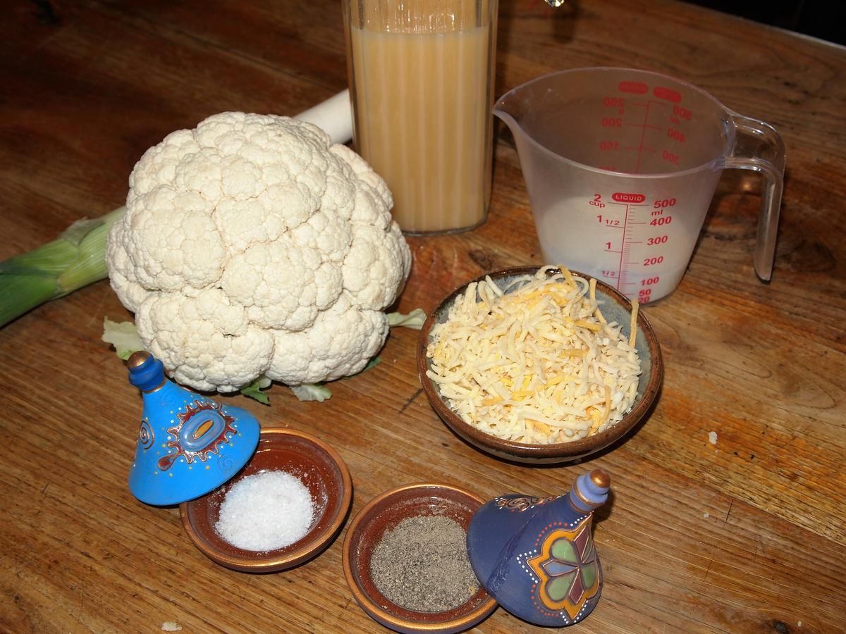 Ingredientes para la crema de coliflor con queso y 7 cuencos comestibles: