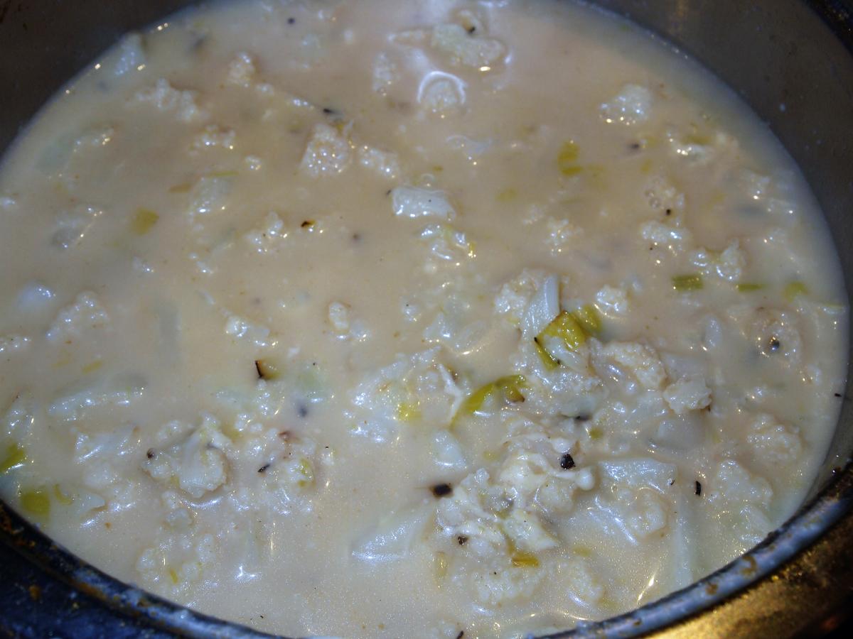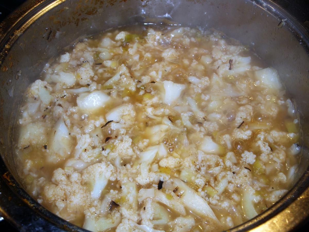Agregamos el caldo o agua hasta que llegue a ebullición y agregamos la coliflor cortada en ramilletes. Sal y pimienta al gusto y dejamos cocer unos 15 minutos.