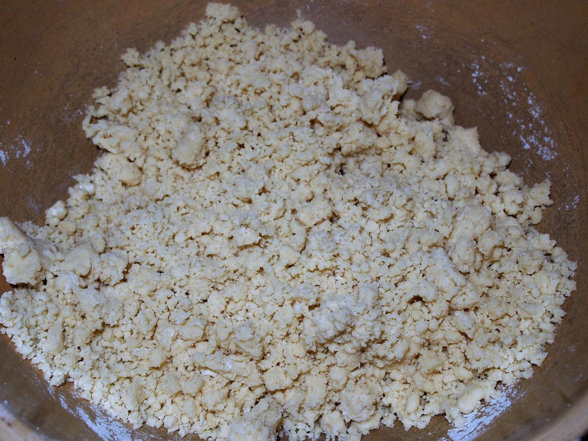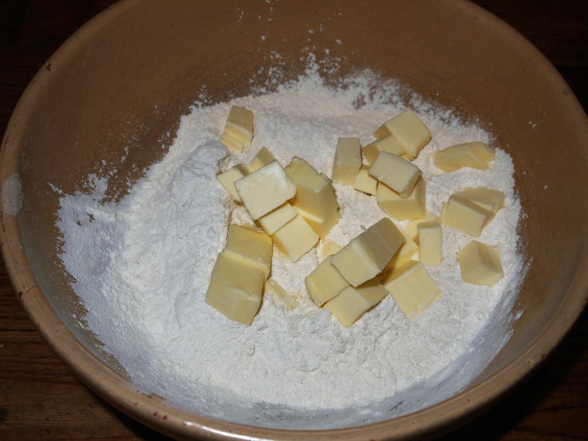 Cortamos la mantequilla fría en dados y la mezclamos con la harina con la punta de los dedos, nos quedara como arena de playa un poco mojada.