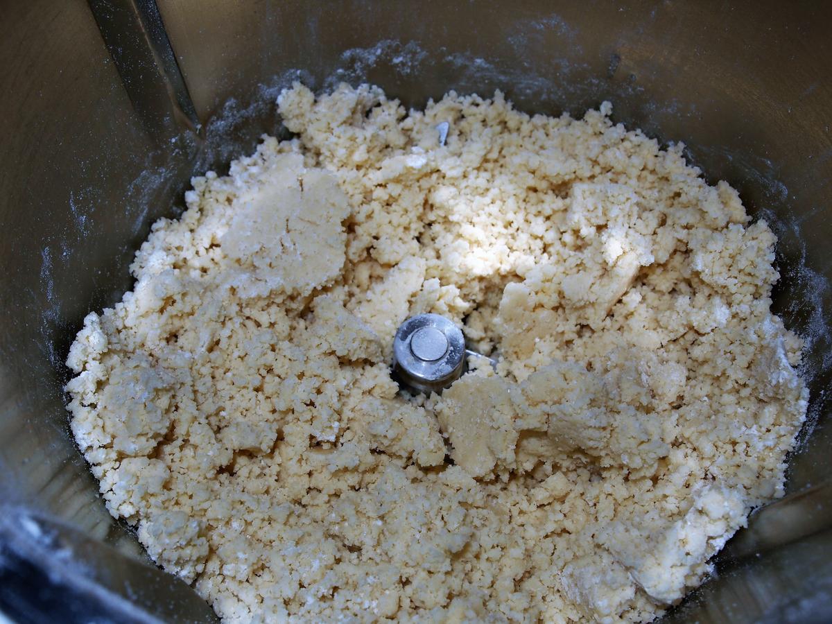 Cortar la mantequilla en dados y mezclar a máxima potencia unos segundos (unos golpes de turbo con la Thermomix). Hasta que parezca arena de playa un poco mojada.