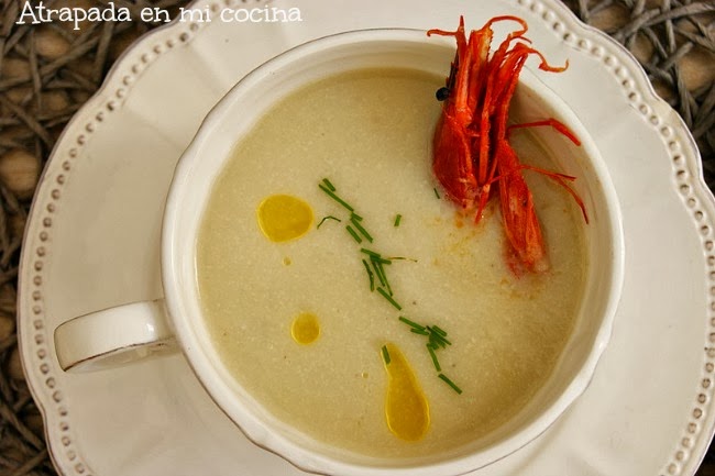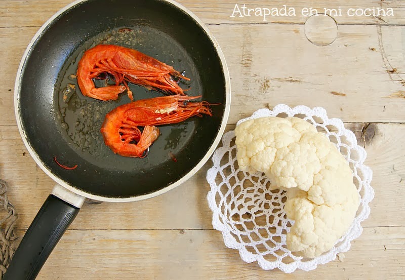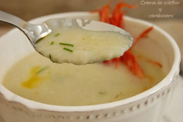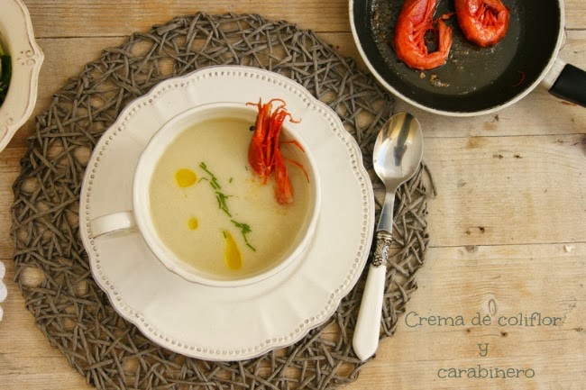 Seguimos con temporal de frío, nieve, viento en toda la Península. Poco apetece salir de casa y, en cambio, lo que apetece es tomar algo caliente. Por eso os traigo esta cremita para acabar la semana. Una de mis verduras preferidas es la coliflor, desde mi adolescencia ha formado parte de mi menús, y curiosamente son pocas las recetas que tengo publicadas con ella. Quería probar con una idea que vi en una revista hace tiempo y es por ello que ha salido esta cremita. Si añadimos el marisco a la crema le daremos un toque distinto, si no nos gusta pues también está muy buena sin él. Intentad que el marisco sea de calidad, en mi caso los carabineros no estuvieron a la altura, eran congelados y no dieron la talla. Podemos sustituirlos con algunas gambas frescas, que seguro que le aportan más sabor, o si os lo podéis permitir por unos carabineros frescos (yo no los veo en los mercados de la zona).