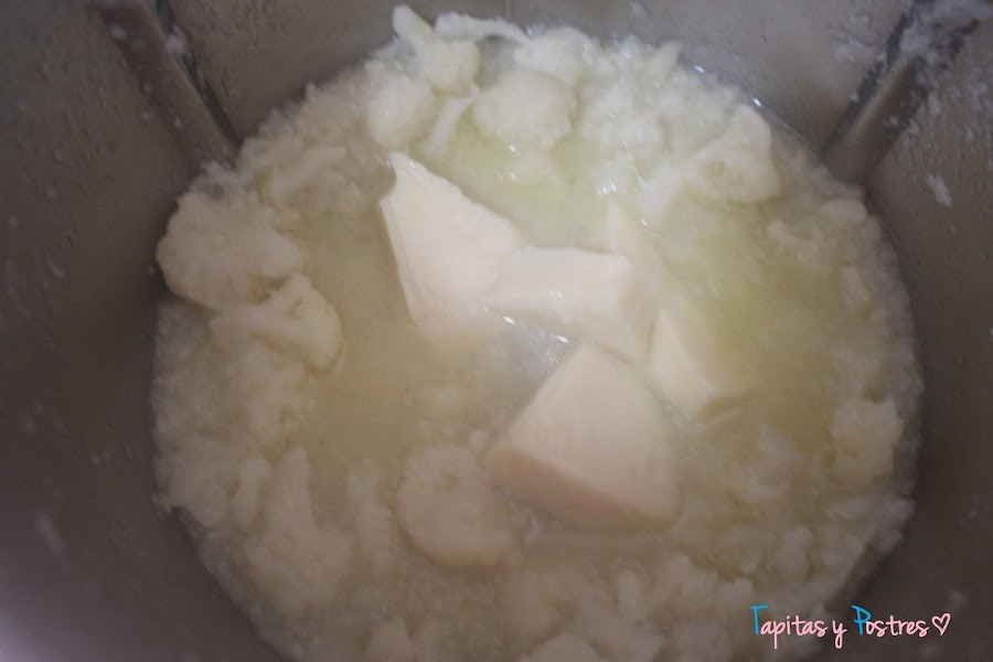 Añadimos la coliflor lavada y en ramitos, el agua, la leche, la sal y la pimienta. Programamos 30 minutos, temperatura varoma y velocidad 1.