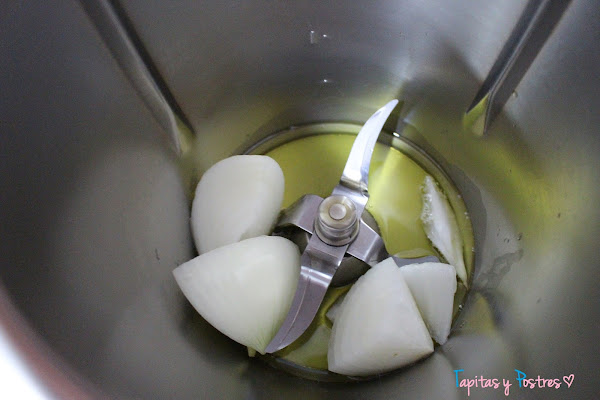 Agregamos la cebolla cortada a cuartos y picamos 4 segundos a velocidad 4. A continuación sofreimos cinco minutos a temperatura varoma y velocidad 1.