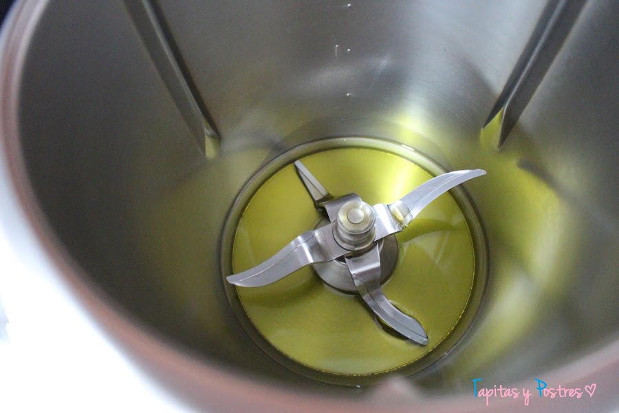 Vamos a usar la thermomix para la crema. Primero ponemos a calentar el aceite 5 minutos a temperatura varoma y velocidad 1.