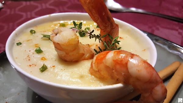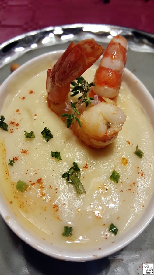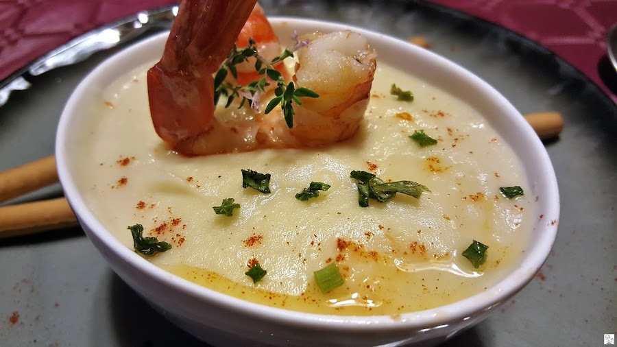 5. Servimos la crema junto con las gambas y la espolvoreamos con pimentón dulce y cebollino picado. Toda una delicia. ¡Buen provecho!