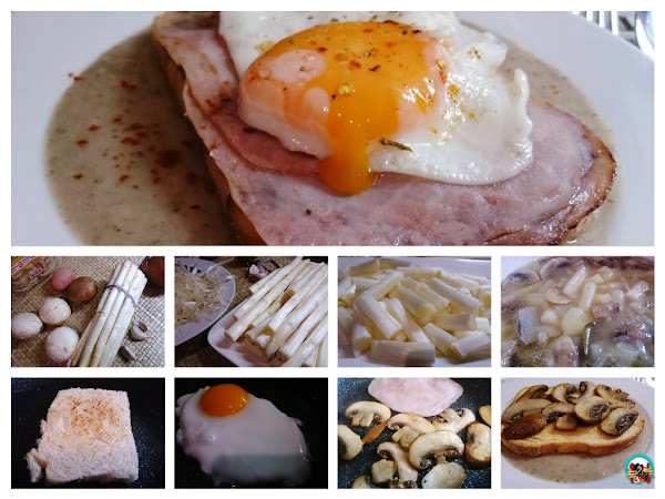 3.- En una sartén ponemos a dorar la rebanada de pan con un poco de aceite de oliva. En la misma sartén freímos el huevo con poco aceite sin que la lleva se ponga dura. Retiramos el huevo y salteamos el champiñon limpio y cortado en laminas. Por últimos doramos un poco el jamón cocido en la misma sartén.