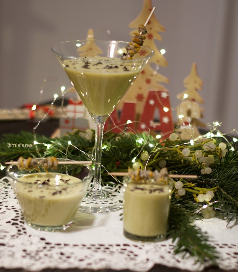 6. Servimos en el vasito acompañado de una brocheta de berberechos y espolvoreamos con polvo de oliva negra.