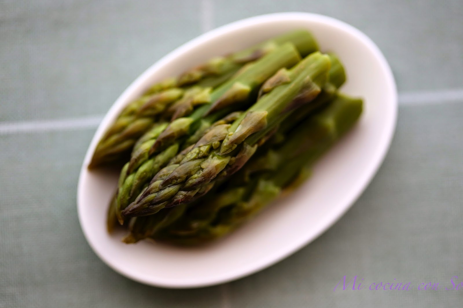 Mientras, escaldamos las puntas de espárragos en agua hirviendo, durante 3 minutos, escurrimos y reservamos.