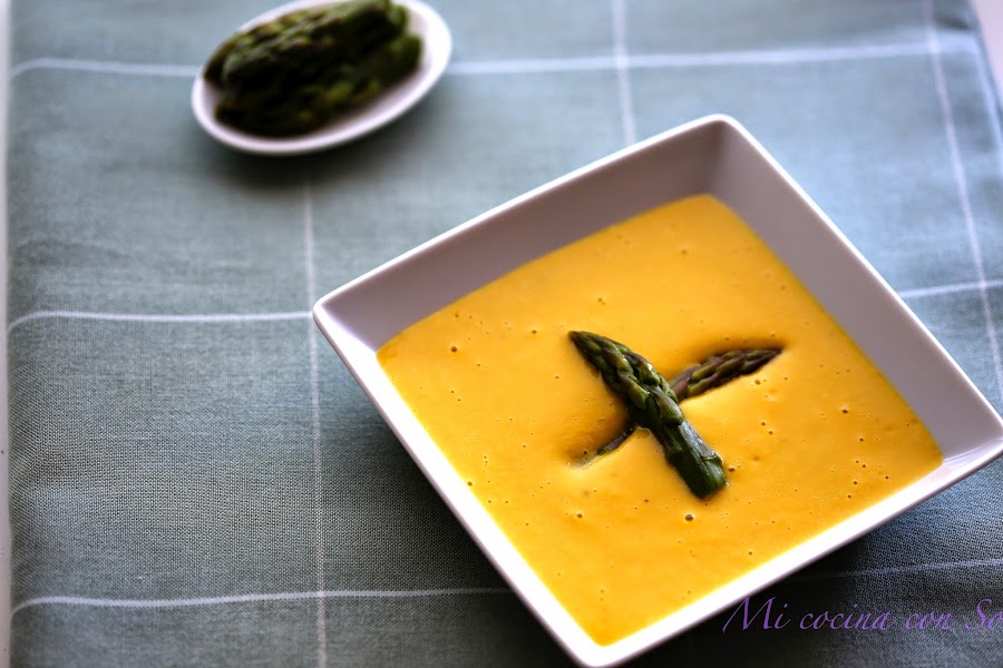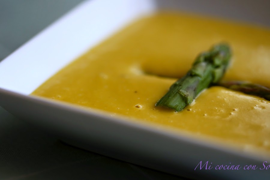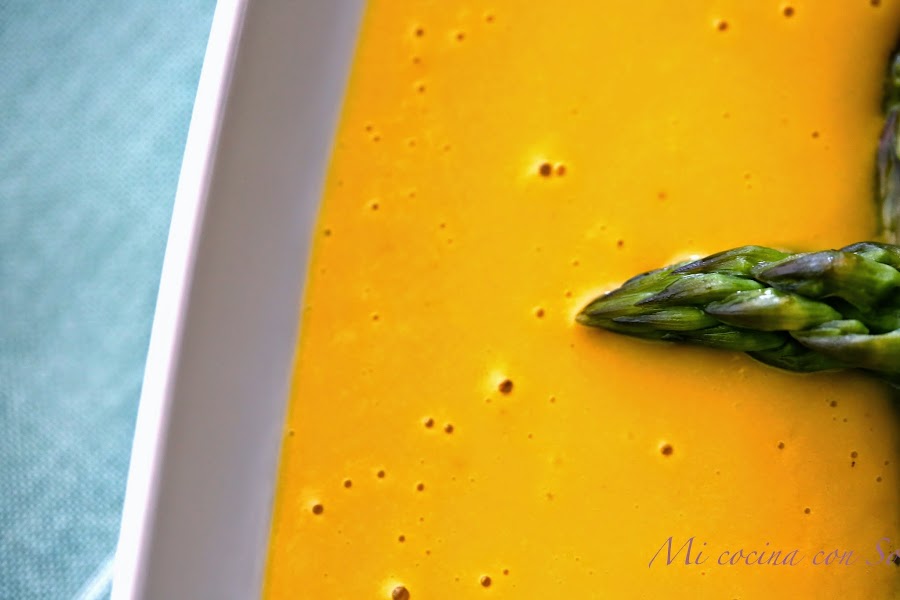 Limpiamos y troceamos los espárragos, reservando algunas puntas enteras. Limpiamos y troceamos el puerro y la zanahoria, los metemos en el vaso junto con el aceite y programamos 8 min., Tª varoma y vel.1.