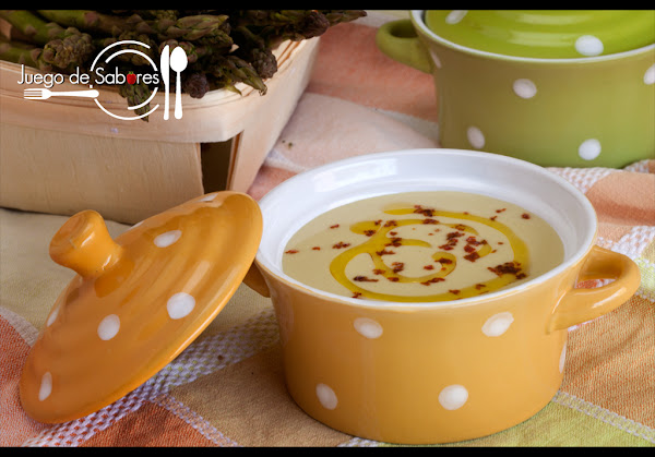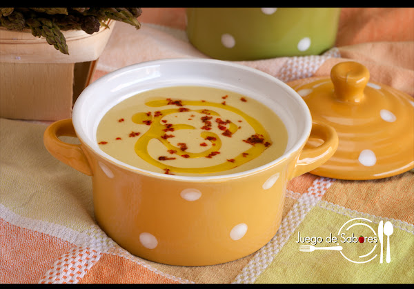 La crema de espárragos puede acompañarse con unos tropezones de pan frito, un hilillo de un buen aceite o con la piel de pimiento asado que se ha secado al horno y que luego se ha pulverizado. Le da un toque de color y de sabor.