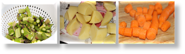 Corta en trozos pequeños las zanahorias, chasca las patatas y limpia los espárragos y corta en trozos pequeños, desechando la parte dura.