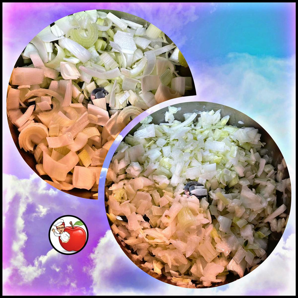 Ahora es el turno del puerro y la cebolla que habremos pelado y troceado y lo picamos 8 segundos velocidad 4 El siguiente paso será sofreír 4 minutos varoma, velocidad 1
