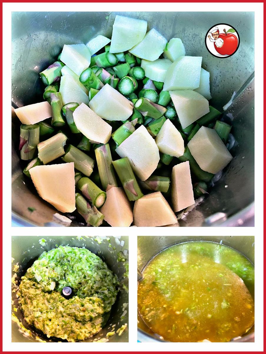 Introducimos la patata pelada y troceada y los trozos de espárragos (las puntas no, las seguimos teniendo reservadas) y programamos 6 segundos, velocidad 4 Lo sofreímos 4 minutos, varoma, velocidad 1 Añadimos el caldo, salpimentamos y programamos 20 minutos, 100º , velocidad 1