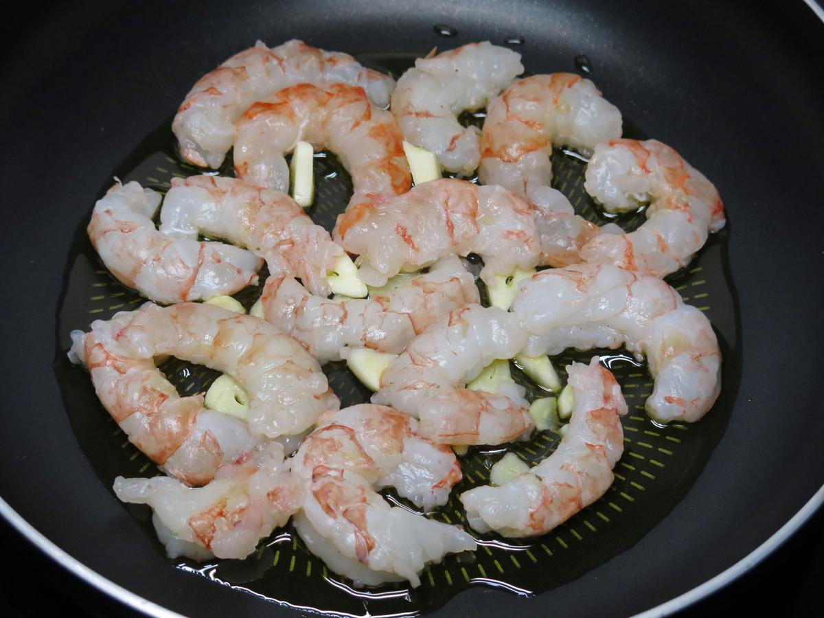 Pelaremos las gambas, y las pondremos a freír con un diente de ajo laminado y aceite de oliva, salaremos, y marcaremos por las dos caras y retiraremos a un plato, reservaremos.