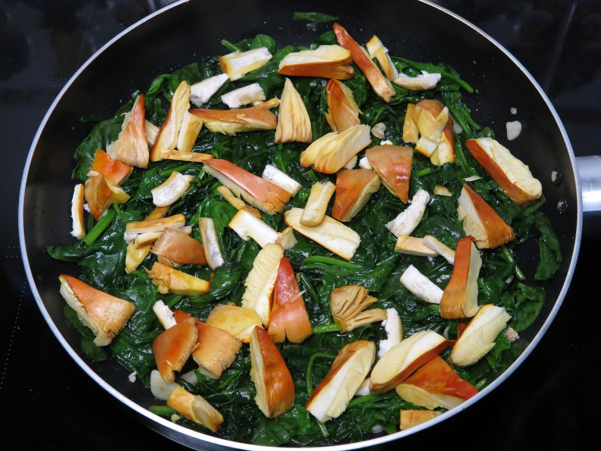 En el mismo aceite, freiremos las hojas tiernas de espinacas, no os preocupéis, parecen muchas, pero quedaran en nada.