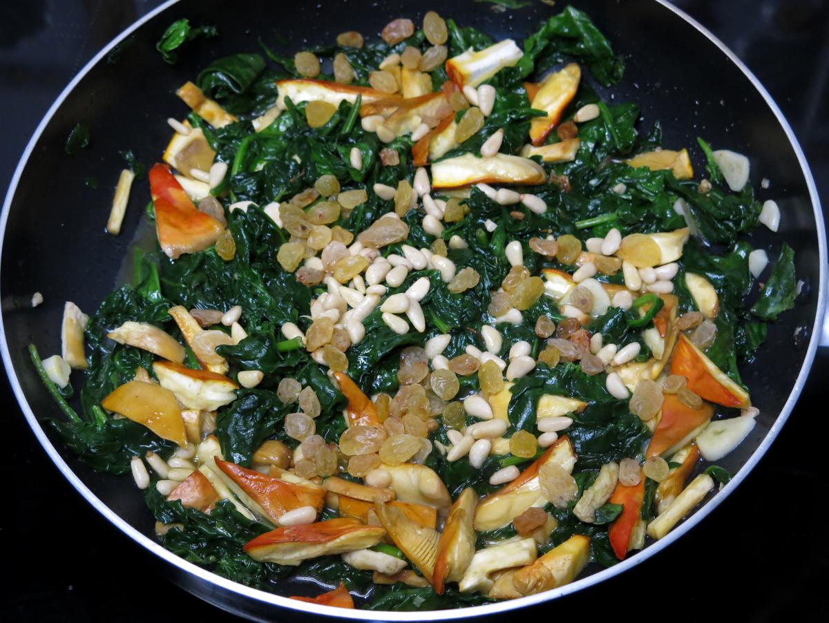Las espinacas con pasas y piñones es una receta deliciosa, sana y sencillísima, originaria de la cocina catalana pero que se ha popularizado mucho en toda la península con pequeñas variantes como esta. Ingredientes para 2 personas: . 2 Manojos de espinacas 3 Cucharadas soperas de pasas sin semillas 1 Cucharada sopera de piñones 2 Dientes de ajo ¼ De Manzana a trocitos 3 Cucharadas soperas de ...