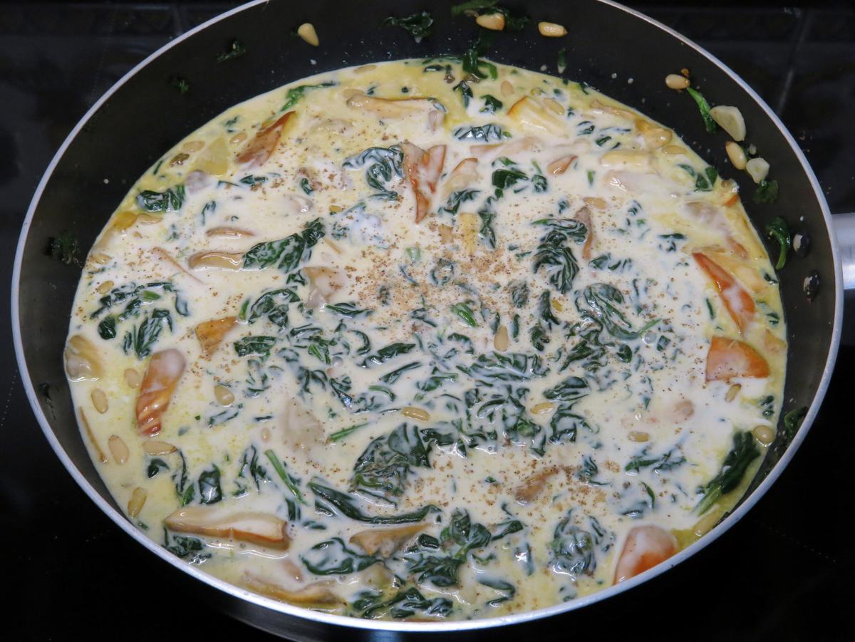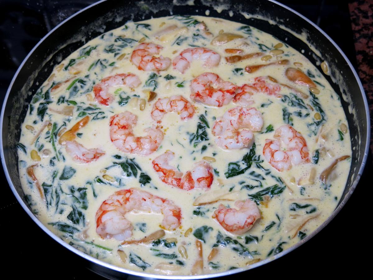 Ingredientes para None comensalesAceite ajos espinacas sal pimienta gambas crema de leche En una sartén pones un poco de aceite, fríes unos ajos laminados y los retiras y reservas. Añades las espinacas y dejas que se vayan cociendo. Cuando creas que ya lo están pones sal, pimienta y unas gambas peladas, unas vueltecitas y añades los ajos. Agregas crema de leche para cocinar y de ...