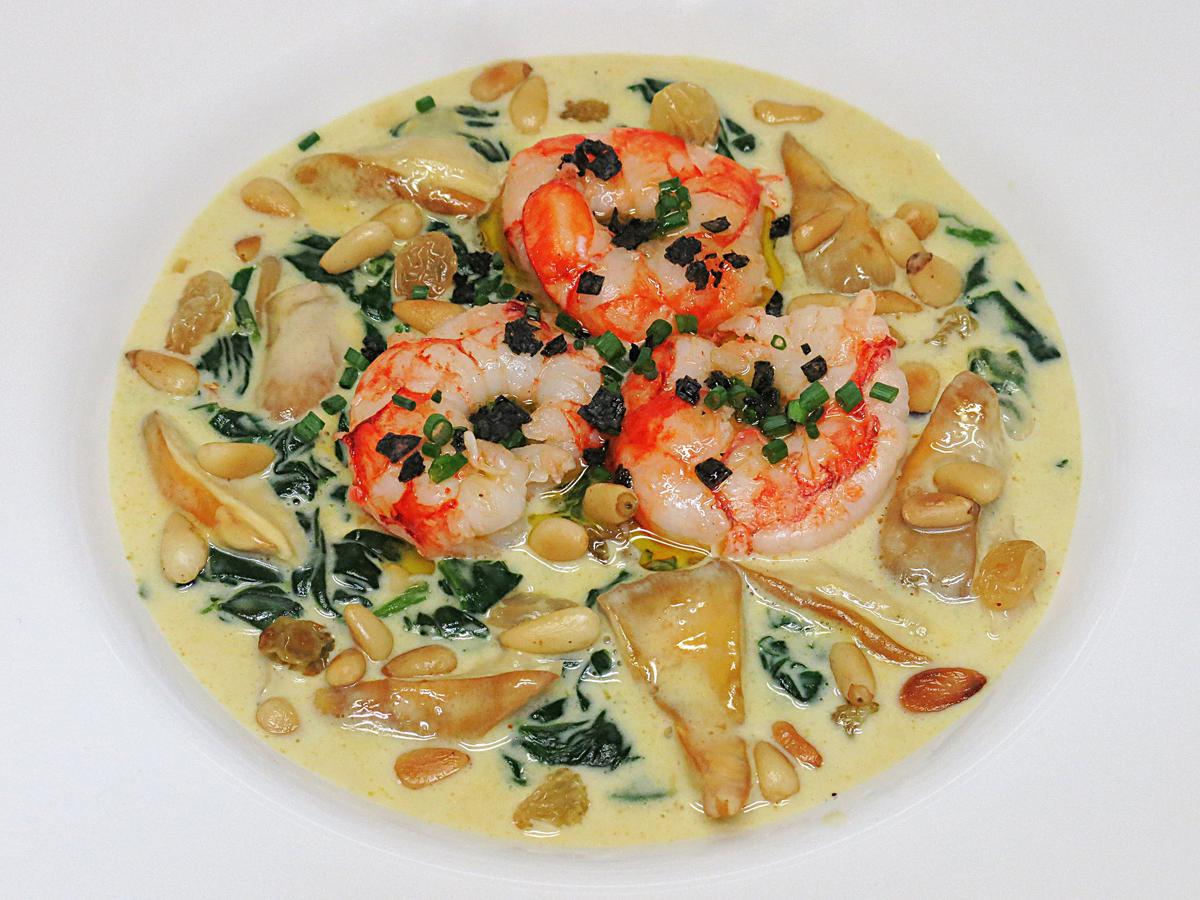 Crema de espinacas con cesáreas, gambas, sultanas y piñones