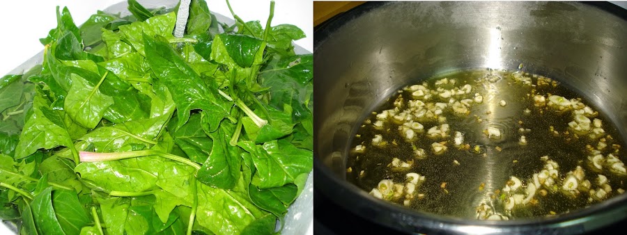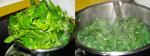 En una olla grande con aceite, doramos los ajos picados y a continuación añadimos las espinacas, poco a poco, pues todas juntas no cabrán, por lo que abultan cuando están frescas, pero a medida que las vamos rehogando van menguando en tamaño. Cuando baje el volumen las troceamos con unas tijeras. Reservamos.