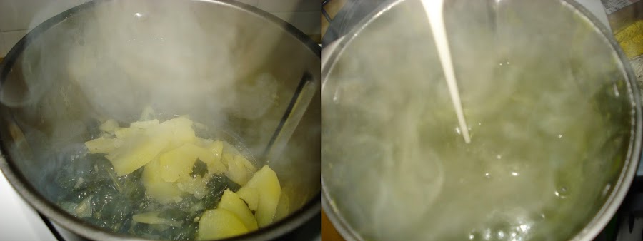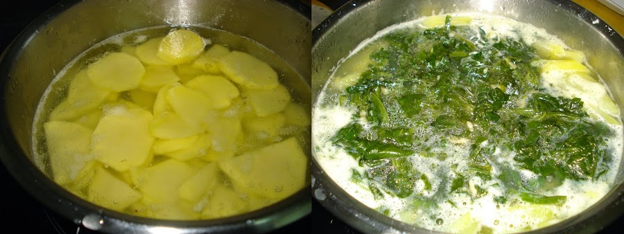 Cuando las patatas estén cocidas les añadimos las espinacas y dejamos que todo junto hierva unos 5 minutos y apartamos.