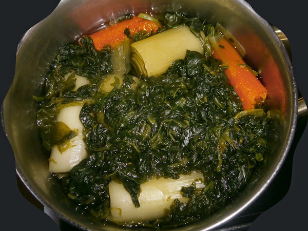 Se hierven todas las verduras durante 15 minutos, y luego se incorporan las espinacas (si son frescas, se cocinan durante 15 minutos más y si son congeladas, se preparan aparte, siguiendo las instrucciones de envasado, y se añaden en la batidora).