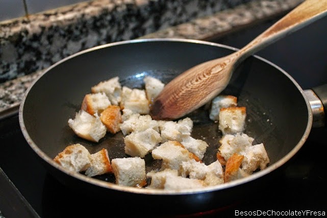 Mientras se hace a fuego lento, cortamos el pan en trocito pequeños para freir. Reservamos.