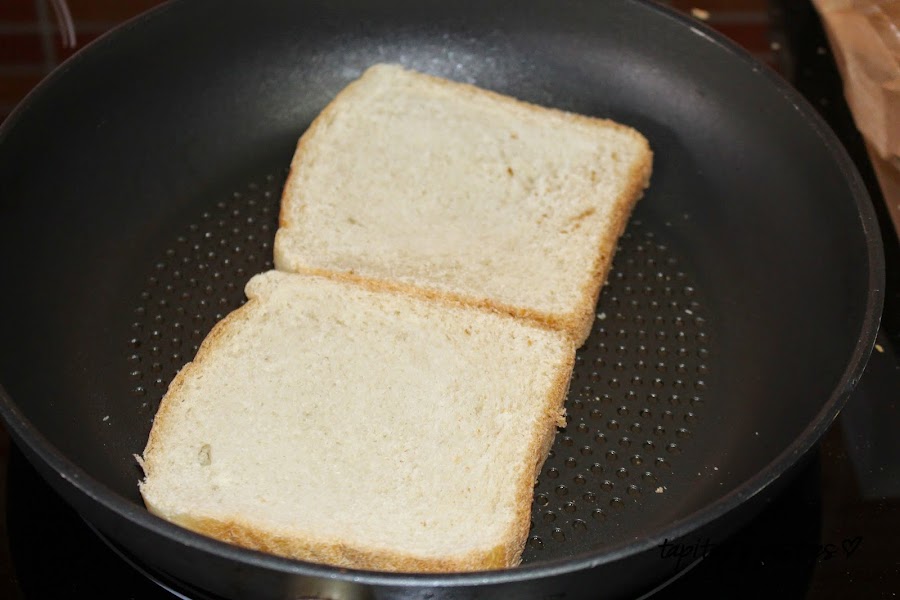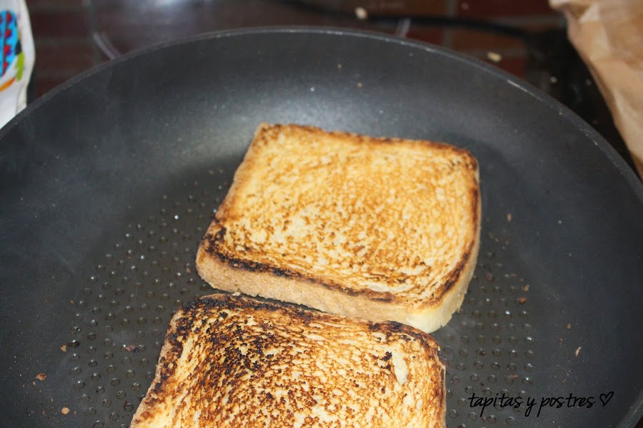 Ahora vamos a tostar dos rebanadas de pan de molde. Como no tengo tostadora lo hago en una sartén.