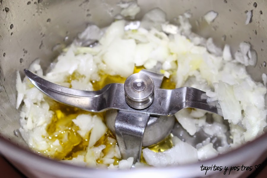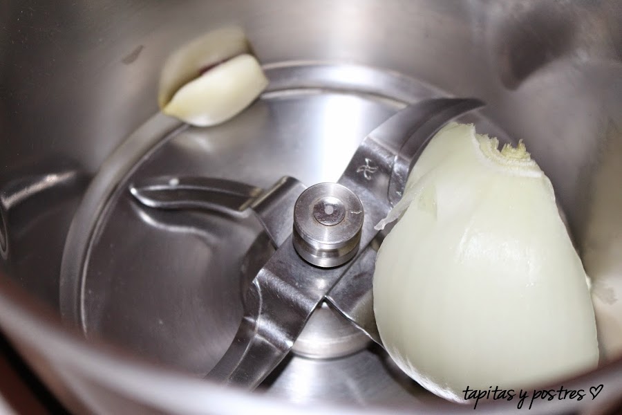 Ponemos en el vaso el ajo y la cebolla en cuartos y picamos dos segundos a velocidad 6.