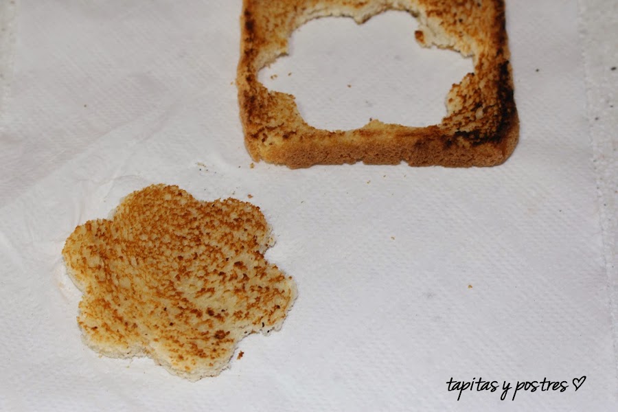 Para darle un toque más chic he cortado las tostadas con un cortapastas. Este tiene forma de flor, pero con el cubilete, en redondo, queda también muy bien.