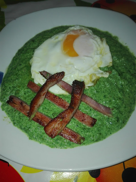 Decoramos con un huevo frito por encima y unas tiras de bacon crujiente.