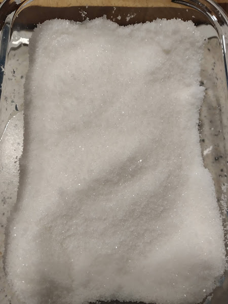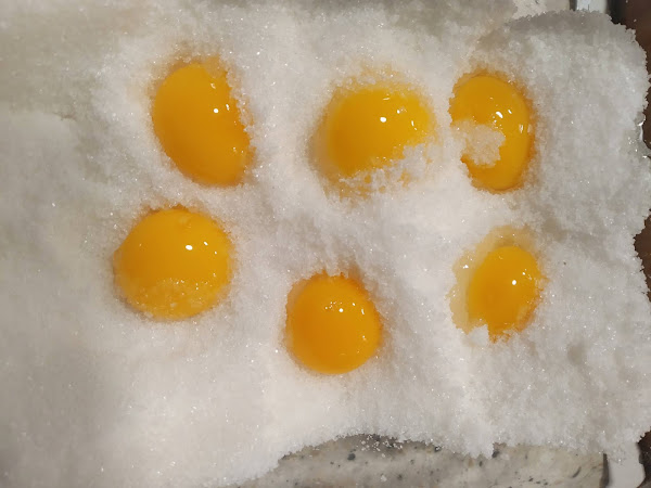Separar con cuidado las claras de las yemas e ir colocando éstas en el recipiente, sobre la cama de sal y azúcar. Seguidamente cubrir con el resto de sal y azúcar. Dejar reposar en la nevera.