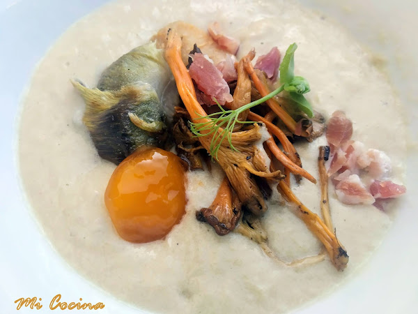 Mientras, le tenemos en “Mi Cocina”, donde intento poder estar a su altura preparando ésta CREMA DE FOIE DE PATO AL AROMA DE BRANDY, ALCACHOFAS CONFITADAS, CHANTARELAS, YEMAS DE HUEVO DE CODORNIZ CURADAS y JAMÓN.