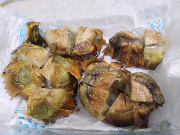 Sacarlas del aceite, cortarlas en varios trozos y colocarlas sobre papel de cocina, reservándolas.