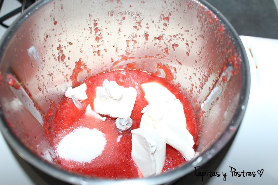 Nos ponemos primero con la crema de fresas triturándolas con el azúcar hasta tener un puré. Yo lo he hecho con thermomix, 10 segundos a velocidad 8-10. Añadimos el queso y la leche condensada y calentamos 6 minutos a 90º y velocidad 4. Cuando falte un minuto para acabar, escurrimos bien las hojas de gelatina y las incorporamos por el bocal de la máquina en marcha para que se mezcle bien. Vertemos la mezcla en vasitos (da como para cuatro vasitos) y dejamos que cuaje.
