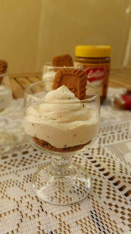 Rompemos un puñado de galletas, y ponemos en el fondo de los vasitos que vayamos a usar, con ayuda de una manga pastelera o con una cuchara cubrimos con la nata montada (crema de leche) con crema de lotus, ya al gusto ponemos mas o menos cantidad y para terminar ponemos media galleta Lotus arriba