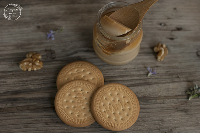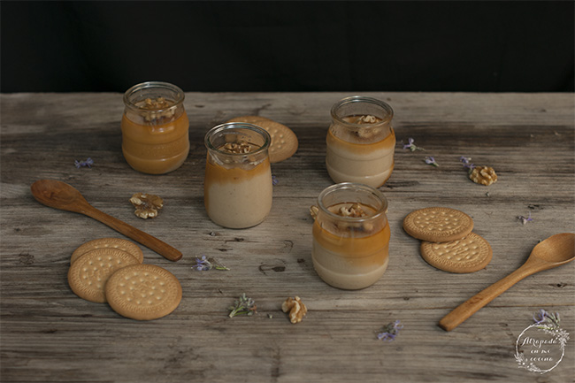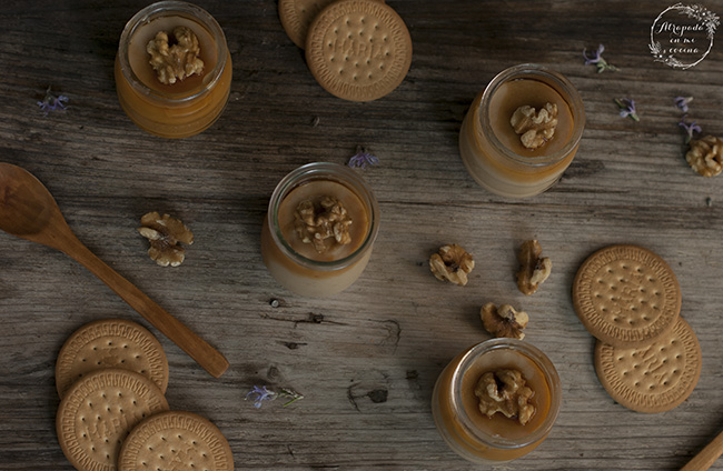 Cuando empiece la leche a hervir añadimos la mezcla reservada y espesamos a fuego lento, sin parar de remover. Ya veréis como no tarda mucho en hacerlo. Retiramos del fuego y vertemos en los vasitos. Dejamos enfriar a temperatura ambiente. Y entonces añadimos el caramelo líquido por encima, un poquito es suficiente. Introducimos en el frigorífico durante unas tres horas para que termine de cuajar, y a la hora de servir añadimos unas nueces picadas.