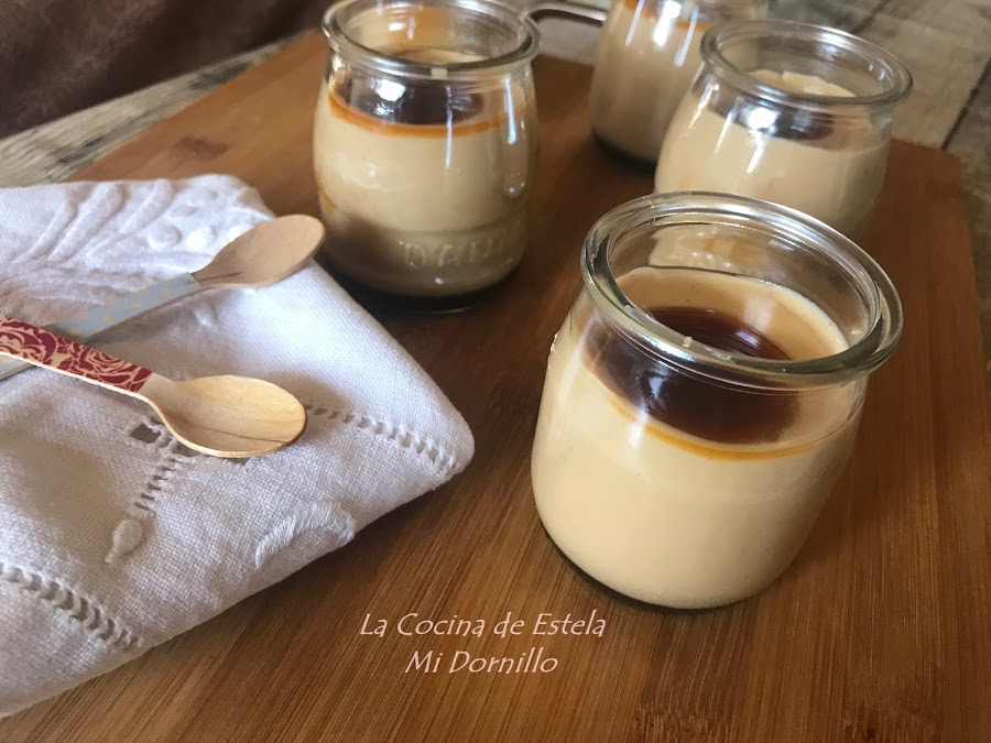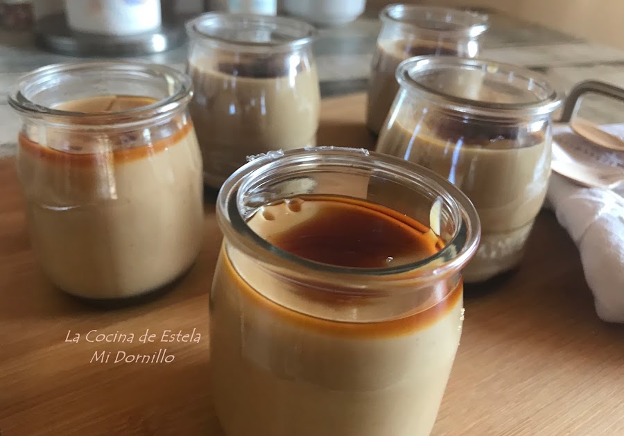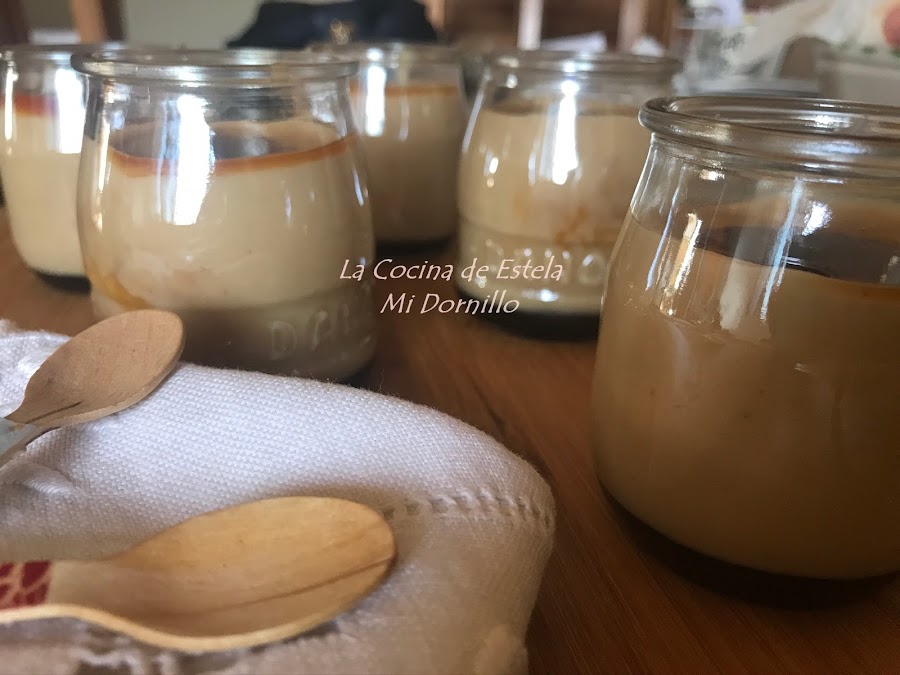 Preparamos los vasitos o recipiente donde las vamos a poner con un poco de caramelo liquido en el fondo.