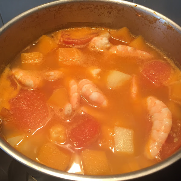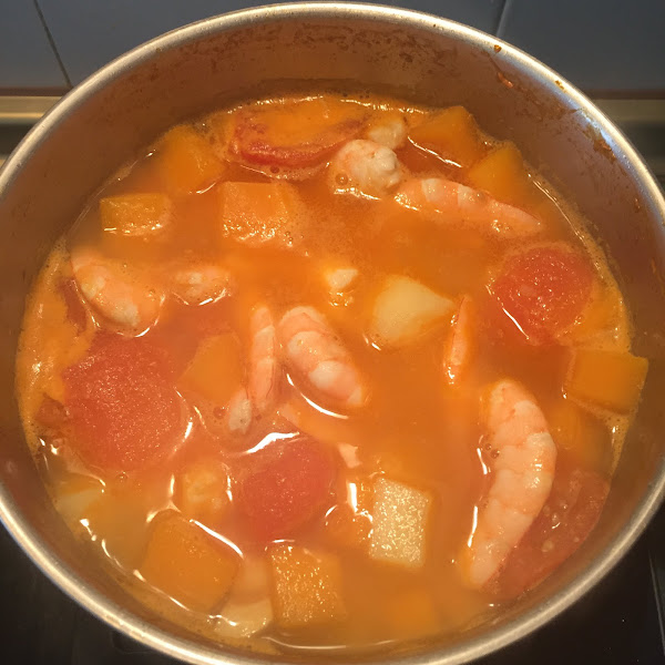 Cuando quede poco tiempo para que las verduras estén blandas, incorpora las gambas peladas y deja cocer otro rato.